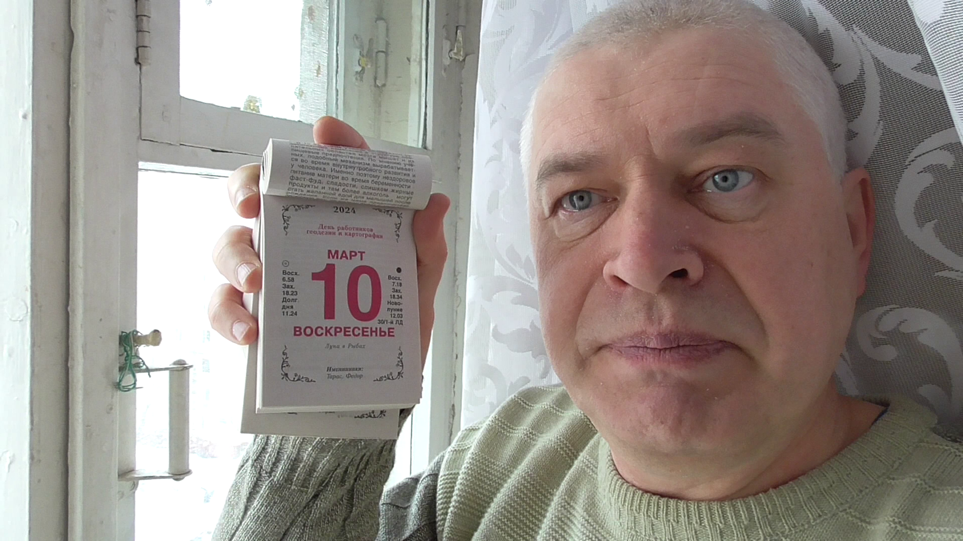 У меня календарь 10 марта 2024 год. Снег идёт за окном
