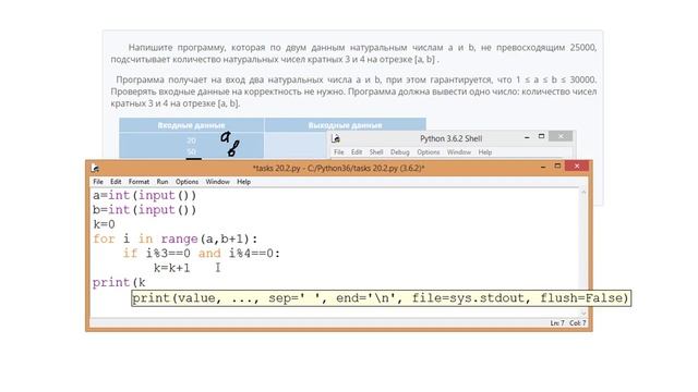 http://egoroffartem.pythonanywhere.com/oge/task/21 На сайте размещены другие задания по этой теме http://egoroffartem.pythonanywhere.com/oge/videotask/21 Список всех разборов 20.2 задания из ОГЭ по информатике: https://www.egoroffartem.ru/oge/videotask/ Видео решения задач по ОГЭ информатике https://vk.com/egoroff_channel_oge В данном группе можете найти информацию о новых видео и задать вопросы по ОГЭ Информатике Разбор задания № 20.2 ОГЭ ИНФОРМАТИКА Тема задачи "Написание программы" Напишите программу, которая по двум данным натуральным числам a и b, не превосходящим 25000, подсчитывает количество натуральных чисел кратных 3 и 4 на отрезке [a, b] . Программа получает на вход два натуральных числа a и b, при этом гарантируется, что 1 ≤ a ≤ b ≤ 30000. Проверять входные данные на корректность не нужно. Программа должна вывести одно число: количество чисел кратных 3 и 4 на отрезке [a, b].