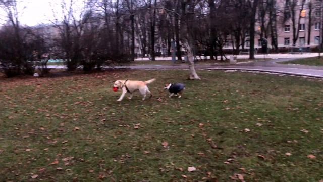 Бульдог и Лабрадор | Играем в мяч | Английский бульдог Черри провожает осень 1