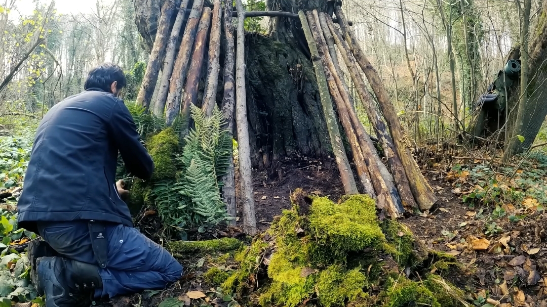 Строительство уютного шалаша в лесу с каменной печью. Бушкрафт
