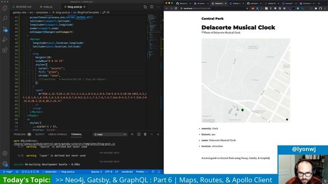 Adding a map with Mapbox GL JS and React. Displaying routes using Neo4j Graph Data Science pathfinding algorithms. Using Apollo Client in Gatsby. Find the code here: https://github.com/johnymontana/central-perk Follow Will on Twitter: https://twitter.com/lyonwj
