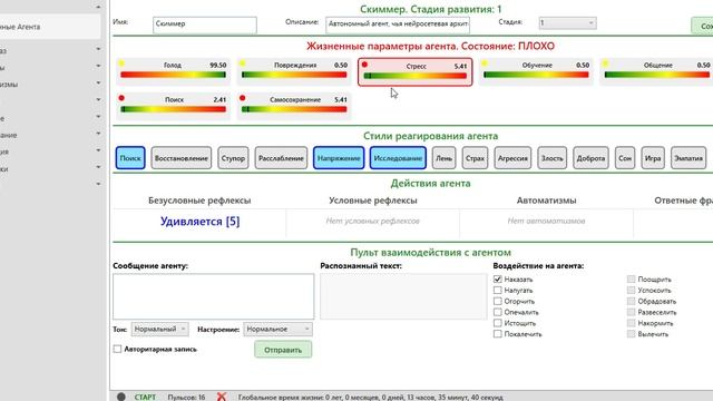 Пульт управления агентом, визуализация параметров гомеостаза, стилей реагирования и ответных действий