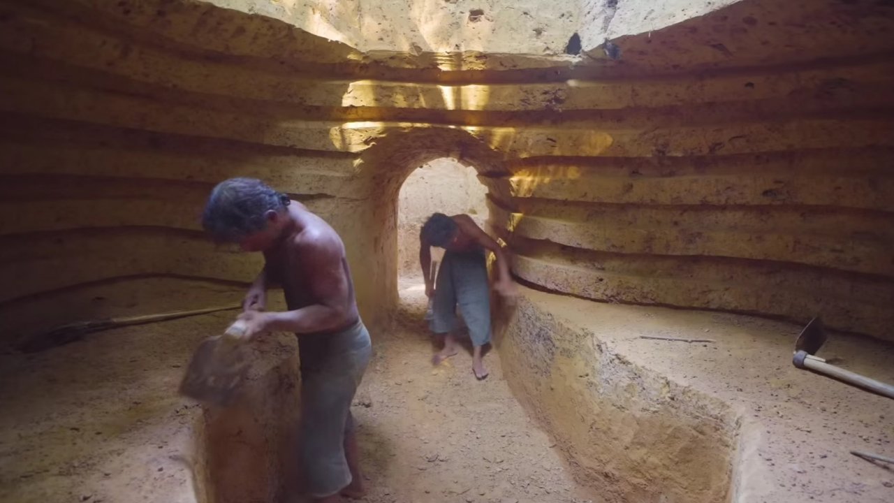 постройка землянки в твердом грунте, убежище.