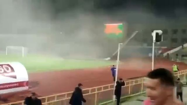 В Шымкенте во время футбольного матча мощный ураган сорвал крышу со здания стадиона. Обломки упали прямо на поле.