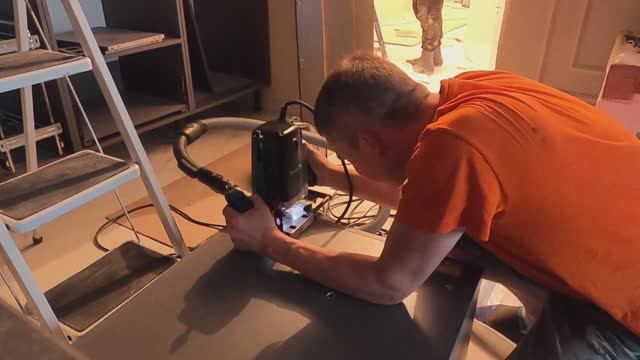 фрезер макита. Фрезеруем ниши для подвесов в задней стенке их ЛДСП, корпус с полками из стекла нужно повесить вплотную к стене. #фрезер_макита