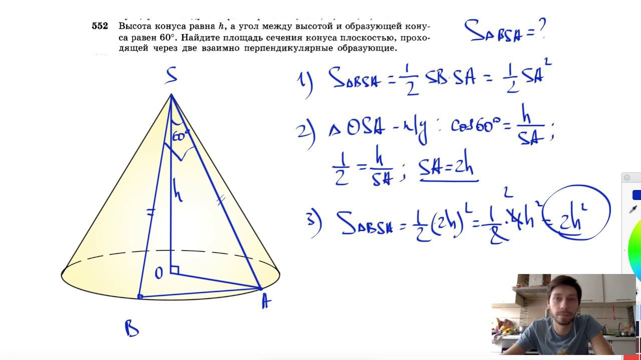 №552. Высота конуса равна h, а угол между высотой и образующей конуса равен 60°. Найдите площадь сечения конуса плоскостью, проходящей через две взаимно перпендикулярные образующие. Поддержать канал рублём - 5469400944002125 (Сбербанк) Мой второй канал для подготовки к ЕГЭ и ОГЭ - https://www.youtube.com/ЕвгенийСумин Инстаграм - https://www.instagram.com/EGE_OGE.math Личный инстаграм - https://www.instagram.com/ee_sumin VK - https://vk.com/evgeniysumin FB - https://www.facebook.com/EvgeniySumin