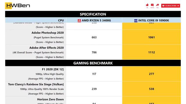 AMD Ryzen 5 3400G vs Intel Core i9 10900K - Apps & Gaming Benchmark (RTX 3090) SYSTEM SPECS: GPU: RTX 3090 RAM: 32GB DDR4 OS: Windows 10 APPLICATION BENCHMARK LIST: 1 - Cinebench R20 2 - 7-Zip File Manager 3 - Adobe Premiere Pro 2020 4 - Adobe Photoshop 2020 5 - Adobe After Effects 2020 GAMING BENCHMARK LIST: 1 - F1 2020 2 - Tom Clancy’s Rainbow Six Siege [Vulkan] 3 - Horizon Zero Dawn 4 - Borderlands 3 5 - Watch Dogs: Legion 6 - Death Stranding 7 - Shadow of the Tomb Raider 8 - Hitman 2 Source: https://hwben.com/amd-ryzen-5-3400g-vs-intel-core-i9-10900k-apps-gaming-benchmark-rtx-3090/ Other benchmark: https://hwben.com BUY FROM AMAZON: - AMD Ryzen 5 3400G : https://hwben.com/noindex/buy.php?q=AMD+Ryzen+5+3400G - Intel Core i9 10900K : https://hwben.com/noindex/buy.php?q=Intel+Core+i9+10900K KEYWORDS: - RYZEN 5 3400G vs CORE I9 10900K - CORE I9 10900K vs RYZEN 5 3400G Partner: https://versuris.com #RYZEN53400G #COREI910900K