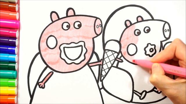 Dibuja y colorea cómo Peppa Pig y su hermano George comen helado&Dibujo para niños