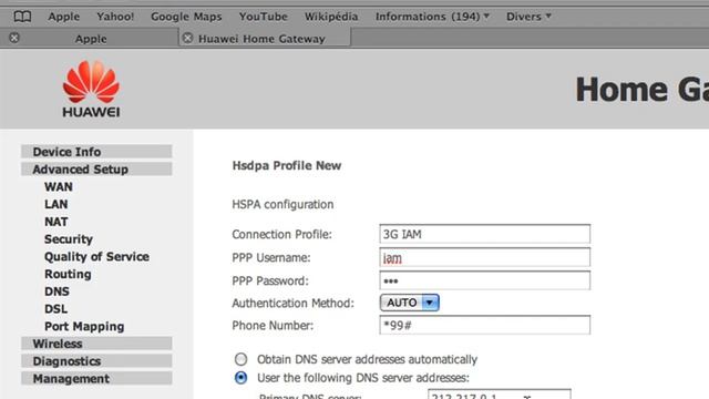 comment configurer un routeur 3G huawei de IAM username : admin password : admin