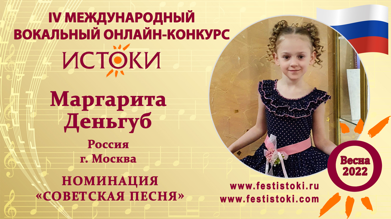 Лауреат II степени IV Международного вокального онлайн-конкурса «Истоки».Весна-2022. Номинация "Советская песня". Песня "Песня о волшебном цветке". Музыка Ю. Чичкова, слова М. Пляцковского. Сайт: www.festistoki.ru / www.festistoki.com E-mail: festistoki@mail.ru