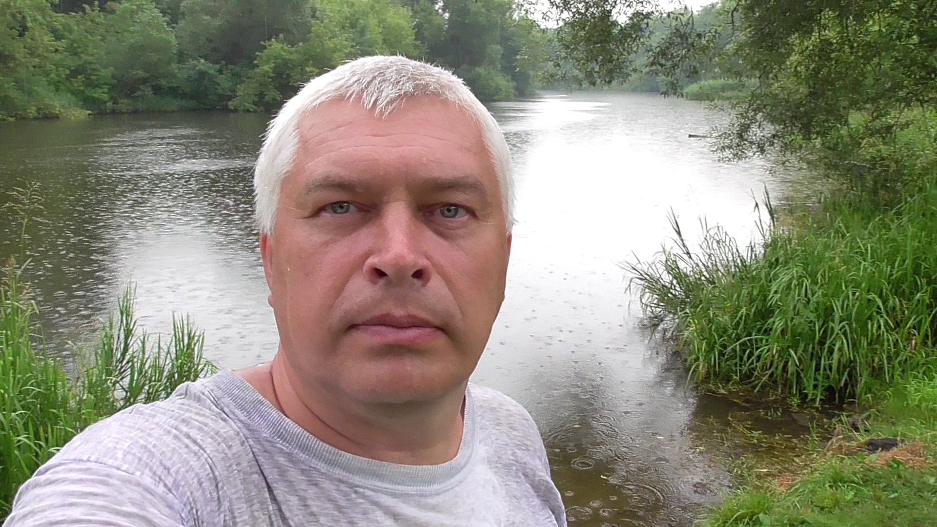 Человек на берегу, река протекает, дождь идёт