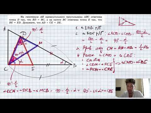 На гипотенузе AB прямоугольного треугольника ABC выбрана такая точка D, что BD = BC, а на катете BC – такая точка E, что DE = BE. Докажите, что AD + CE = DE. Телеграм - https://t.me/geometry0 Сайт - https://taplink.cc/ege_oge.math Мой второй канал для подготовки к ЕГЭ и ОГЭ - https://www.youtube.com/ЕвгенийСумин TikTok - https://vm.tiktok.com/WJJwK9 Инстаграм - https://www.instagram.com/EGE_OGE.math Личный инстаграм - https://www.instagram.com/ee_sumin VK - https://vk.com/evgeniysumin