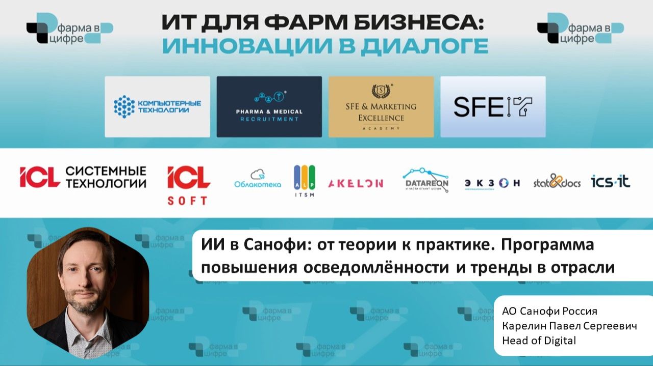 АО Санофи Россия. Карелин Павел Сергеевич, Head of Digital Искусственный интеллект в фарме — это уже не эксперимент, а массовая управляемая трансформация. Но как перейти от разговоров и пилотов к реальной пользе для бизнеса и сотрудников? В этом докладе Павел Карелин, Head of Digital Sanofi Russia, делится опытом внедрения корпоративной программы «ИИ в Санофи» — от теории и трендов до практического применения ИИ в ежедневной работе. Это честный рассказ о том, как крупная международная фармкомпания выстраивает ИИ-стратегию, обучает сотрудников и управляет рисками в условиях жёсткой регуляторики. В видео: • почему ИИ — главный тренд 2025 года для фармы; • на каких этапах внедрения ИИ сегодня находятся фармкомпании; • структура и логика программы «ИИ в Санофи»; • как повышать ИИ-грамотность сотрудников, а не просто внедрять инструменты; • роль ИИ-амбассадоров и внутренних комьюнити; • ответственное использование ИИ: комплаенс, безопасность, этика, data privacy; • какие ИИ-кейсы реально востребованы сотрудниками (документы, контент, HR, аналитика, презентации); • обзор ключевых трендов ИИ на фармрынке в России и мире; • примеры use cases Big Pharma и российских компаний; • партнёрская модель: build / buy / build+buy и где чаще всего возникают разочарования; • почему 89% ИИ-проектов сталкиваются с эффектом overpromise & underdeliver; • трансформация роли медицинского представителя: от передачи информации — к стратегическому управлению экосистемой; • горизонты 2030: AI Copilot, Next Best Action, персонализация, управление P&L территории; • ключевые риски: фрагментация данных, дефицит навыков, галлюцинации ИИ; • стратегические императивы: ИИ-стратегия, data governance, AI governance, развитие мета-навыков. Отдельный акцент сделан на главном выводе: ИИ — это не технология, а управленческое и культурное изменение. Без стратегии, данных и людей он не работает. Доклад будет особенно полезен: • ИТ- и digital-директорам • руководителям коммерческих и медицинских функций • HR и L&D командам • всем, кто отвечает за внедрение ИИ в фарме • тем, кто хочет перейти от пилотов к системному эффекту Формат — стратегия + практика + честный взгляд на ограничения, без маркетинговых обещаний.