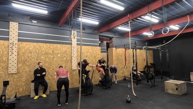 Комплекс Меткон В парах*: 6 интервалов 2 мин работа/2 мин отдых 10 берпи 12 подносов ног Максимум рывков гантели *смена атлетов каждый интервал * 69 (повторения) Комплекс Меткон На время, в парах: 100/90/80 калорий 80 русских махов гирей 24/16 кг 60 выпадов с гирей 24/16 кг 40 приседаний с гирей на груди 24/16 кг 20 боковых берпи через гирю 10 канатов Крышка: 20 минут * 11:31 (время)