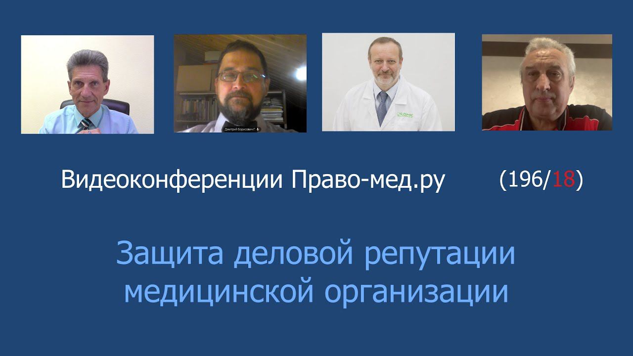 Видеоконференция Право-мед.ру № 196 (18) от 16 июня 2022 года, на которой обсуждался пример реагирования учреждения здравоохранения на публикацию в социальной сети Тема: Защита деловой репутации медицинской организации Рассмотренный вопрос 1.Пределы реагирования медицинской организации на распространение информации в социальных сетях о ненадлежащем оказании медицинской помощи с учетом требований по соблюдению врачебной тайны Тайминг Панов А.В., вступление 01:36-05:34 Гаганов Д.Б. 05:52-09:56 Степанов И.О. 10:28-14:08 Панов А.В. 14:10-15:58 Васильев И.В. 16:32-19:48 Участники: Панов Алексей Валентинович, главный редактор информационного портала Право-мед.ру, г. Омск , член АЮР Гаганов Дмитрий Борисович, юрисконсульт Ассоциации организаторов здравоохранения в онкологии г. Санкт-Петербург Степанов Игорь Олегович, врач - невролог, юрист, председатель Ярославской областной общественной организации инвалидов-больных рассеянным склерозом "Гефест", г. Ярославль, член АЮР Васильев Игорь Валерьевич, доцент кафедры общественного здоровья и здравоохранения НГМУ, г. Новосибирск, член АЮР
