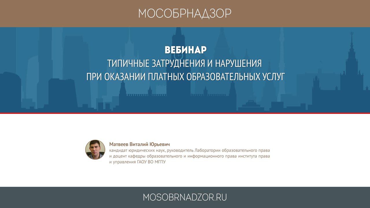 Вебинар «Типичные затруднения и нарушения при оказании платных образовательных услуг» был проведен в рамках проектов Мособрнадзор.РФ и Правоспо.РФ 20 марта 2020 года. Ведущий вебинара - Матвеев В.Ю. Страница вебинара на сайте проекта мособрнадзор - http://mosobrnadzor.ru/supervision/webinars/2020-03-20_16-30