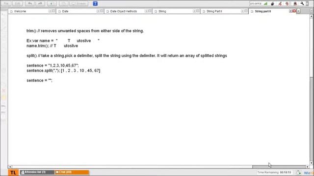 A string is a collection is characters enclosed in single or double quotes. In this class, we will be finding out the length of a string, finding an index of a character and many more. For class files and notes visit http://www.tutoslive.com/tutoslive/classDetails/44/JavaScript-Date-and-String-Objects. To get a chance to view the live class and clarify your doubts, register at http://www.tutoslive.com/tutoslive/register