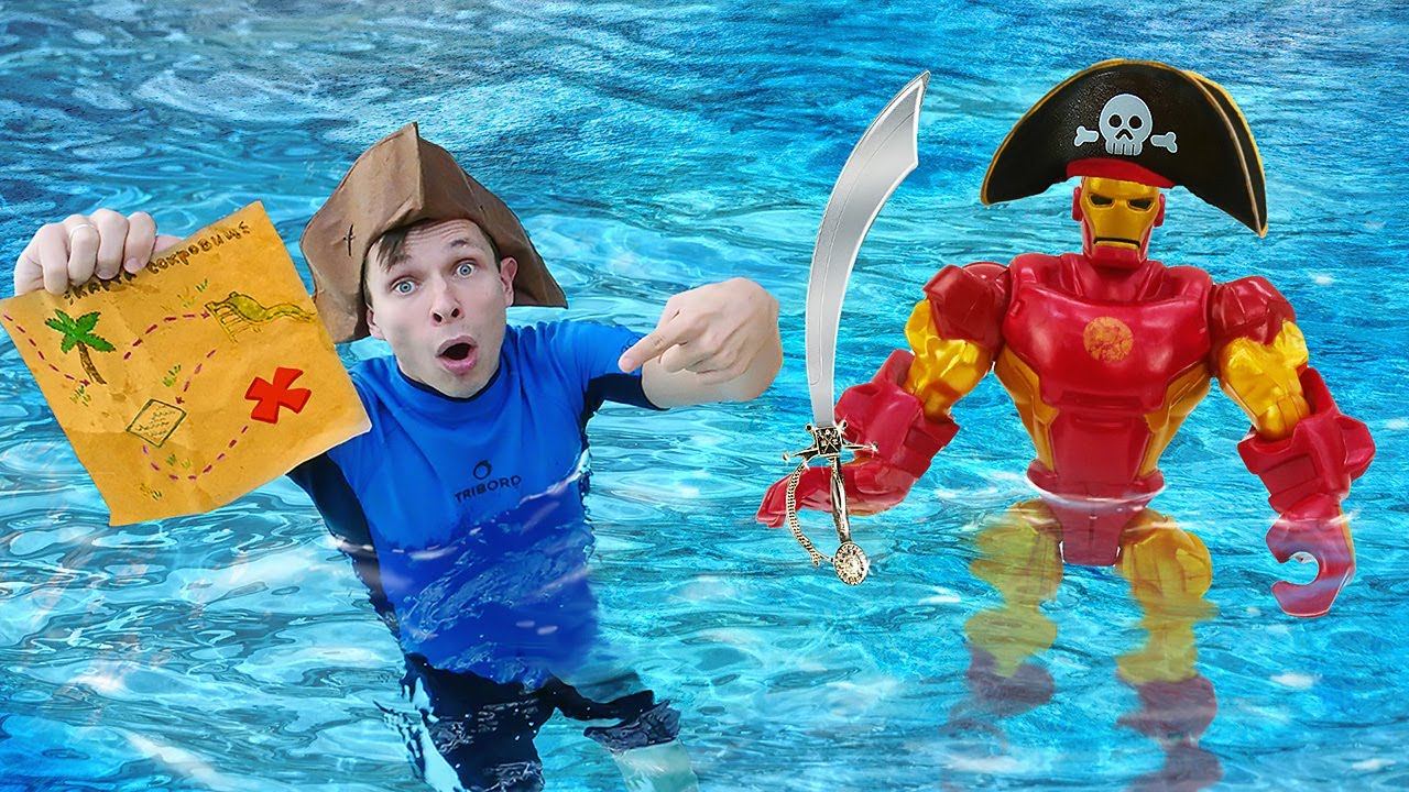 Новые игры онлайн - Железный Человек ищет Сокровища Пиратов в Аквапарке! - Смешное видео шоу Акватим