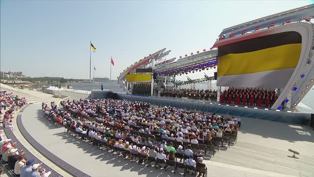 Глава государства принял участие в церемонии подъёма флагов Российской Федерации, СССР и Российской империи в акватории Финского залива. Санкт-Петербург 17 июня 2023 года. Владимир Путин наблюдал за церемонией с воды – на борту яхты «Охта». Пояснения Президенту давала заместитель генерального директора компании «Газпром Нефть», генеральный директор ООО «Газпром Лахта» Елена Илюхина. Торжественное мероприятие сопровождалось праздничным концертом на сцене большого амфитеатра «Лахта центра». Прозвучал Государственный гимн России в исполнении Национального филармонического оркестра под управлением В.Спивакова и хора Государственной академической капеллы Санкт-Петербурга. Флагштоки высотой 179,5 метра над уровнем воды установлены на береговой линии у Парка 300-летия города. Возведение флагов приурочено к датам учреждения каждого из них: 330 лет – триколору Петра Первого, 165 лет – флагу Российской империи, 100 лет – Красному знамени. Проект реализован ПАО «Газпром», в его рамках также планируется обустроить береговую линию парка.