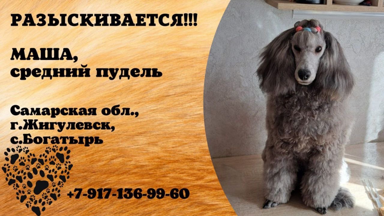 Самарская Жигулевск Пропала собака Пропала собака породы средний пудель, кличка Маша. Территориально в с. Богатырь, но может убежать в другие сёла. Имеет серо- голубой окрас шерсти, длинную, густую гриву, на голове заплетены разноцветные резинки. Собаке нужна медицинская помощь!!! Маша стоит на учёте в РКФ !!! ( Российская кинологическая Федерация) это говорит о том, что её нельзя ни продать, ни сводить на выставку без предоставления документов ( паспорта). Если кто увидит или владеет любой информацией, просьба, сообщите по телефону 89171369960 за вознаграждение!!! Инфо: https://vk.com/wall-198815410_187025 #пропала_собака#самарская#жигулевск#пудель