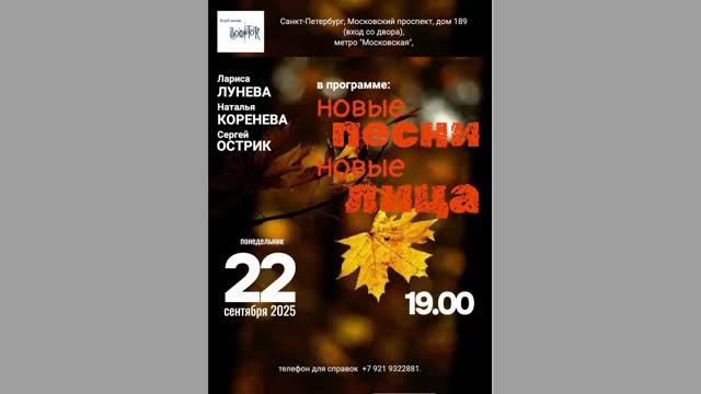 Наталья Коренева, Лариса Лунёва, Сергей Острик. В программе: новые песни. Новые лица. Клуб песни «Восток». 22 сентября 2025 г. Видеозапись - Алла Левитан. Запись звука - Людмила Бойко. Обработка звука - Николай Алфёров. Санкт-Петербург, Московский пр., д. 189.