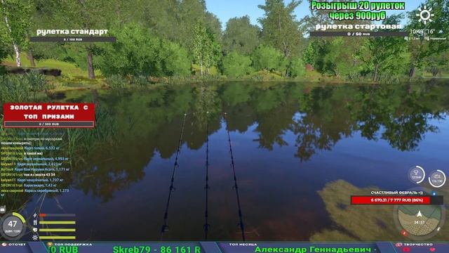 Поддержка донатом https://new.donatepay.ru/@1032463 Альтернативный донат https://www.donationalerts.com/r/kalyamba11 5536913964533059 карта Тинькоф Если стрим лагает,смотри стрим на трово https://trovo.live/s/Kalyamba_na_Ribalke Мой ВК - https://vk.com/kalyantv НИК в игре kalyan11 НАШ ДИСКОРД СЕРВЕР https://discord.gg/mSbnTJK8TB Заказ водоема на 1 час - 500р ( весь стрим 2500р ) Модерка на канале 1200р ( каждая следующая на 100р больше) Озвучка доната на 40р,50р,100р,200р,300р,500р,1000р ✅Призы в рулетке "ЗОЛОТАЯ" ✔ ЗОЛОТО ✔ ПРЕМ ✔ КАТУШКИ РАПТОР 40, АЗИМУТ 10000, СИЛЬВЕР 80, ТАЙГА с 30 ✔ ПАЛКИ ПИЛКЕРНАЯ, ДОНКА МОРСКИЕ, ✔ РОД ПОД, СТУЛЬЯ ✅Призы в рулетке СТАНДАРТ : ✔ катушка "РАПТОР 40" ✔ катушка "АЗИМУТ 10000" ✔ катушка "ТАЙГА С30, С40," ✔ катушки 60 для медного ( ЭВИИ, НАТОРЫ, ГОЛДА, и тд) ✔ ПИЛКЕРНОЕ УДИЛИЩЕ КОРОЛЕВА ОКЕАНА ✔ Морское Донное удилище ✔ прем ( 3, 7, 30 дней) ✔ золото ( 1, 3, 5, 10, 20 ,50) ✔ билет на море ( 1, 3, 5 дней) ✔ голд наживка и др. ✅Призы в рулетке "СТАРТОВАЯ" ✔ катушка "silver80" ✔ катушка "БЕЛЫЙ КАЛИБР" ✔ катушка "Черный калибр" ✔ катушка "Протон" ✔ катушка "Нарга 6000" ✔ Набор Фидерист и спинингист ✔ Карповик Фортуна ✔ фидерные удилища ✔ прем, золото, алкашка, наживки и тд P.s Рулетка это не казино, а награда за поддержку стримера. Вечный ТОП ПОДДЕРЖКИ (11.05.2024) 1. Dimon_pokemonchik 119 784 2. Interceptor 75 508 3. Skreb79 71 261 4. une personne 68 619 5. Нарвал77 31 550