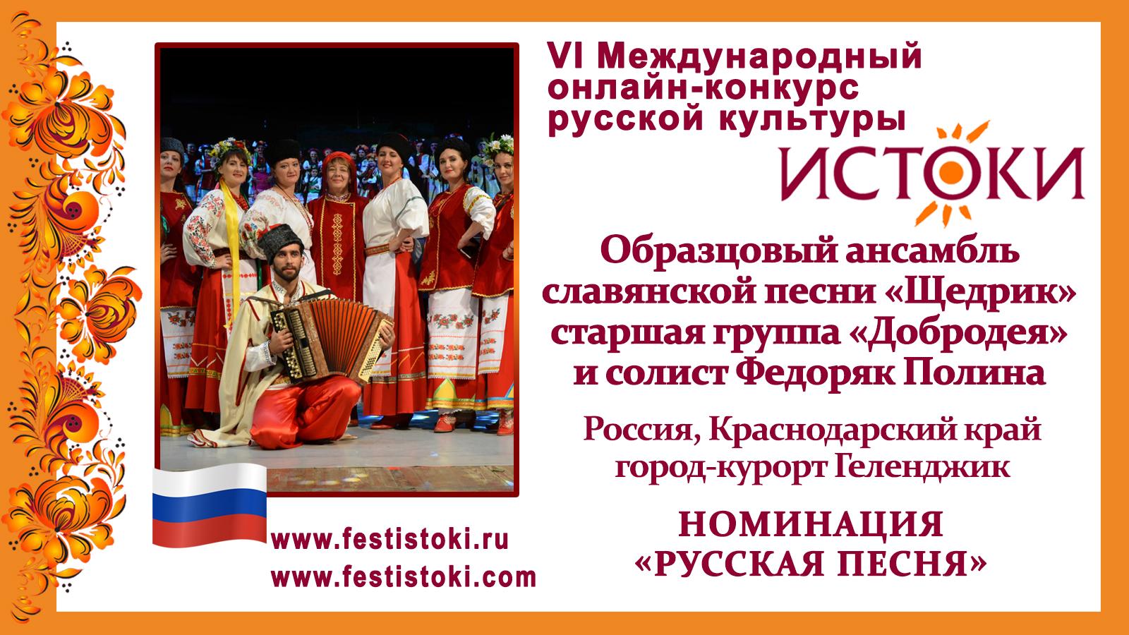 Участник VI Международного онлайн-конкурса русской культуры "Истоки". Номинация "Русская песня". Песня "Русь православная" из репертуара Анны Сизовой. Обработка Федоряк Т.А. Сайт: www.festistoki.ru / www.festistoki.com E-mail: festistoki@mail.ru