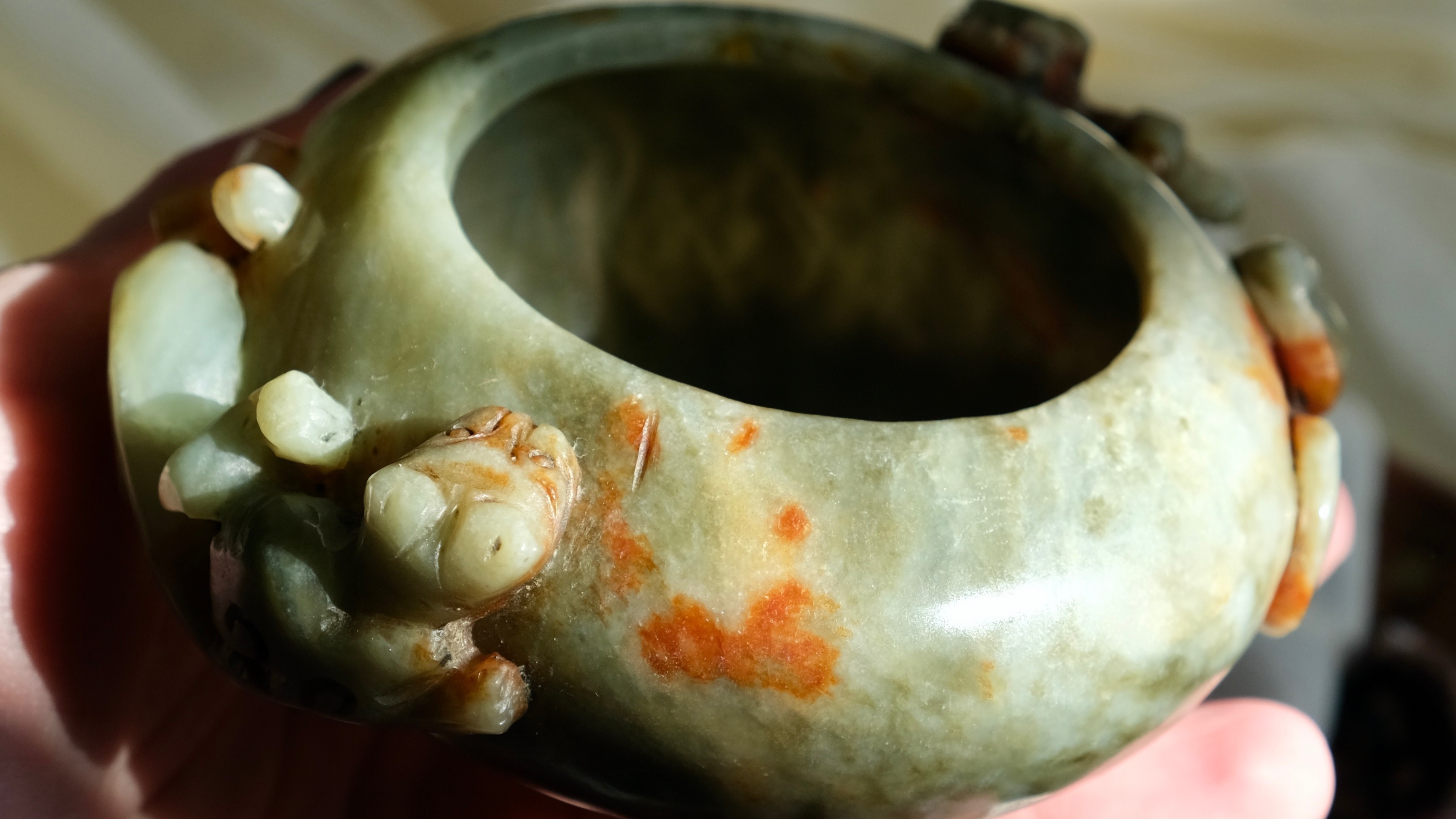 ритуальная чаша/пиала _Два Дракона/Хранители Мудрости_коллекционная Ручная работа, выполнена из из камня Лань Тянь Юй (蓝田玉). Данный камень добывается в одноимённом уезде провинции Шэньси, недалеко от города Сиань (является кальцитом CaCO3). Твёрдость от 3 до 4, достаточно лёгок в обработке. По внешнему виду и цвету напоминает нефрит. Чаша старая, у верхнего края, есть небольшое отверстие, жидкость из него не вытекает Украшают чашу два Дракона хранителя… Ширина (от ручек) - 11 см. Ширина чаши 9,4 см. Высота 3,8 см. Объем (до краев) 180 мл. Вес - 205, 72 см.