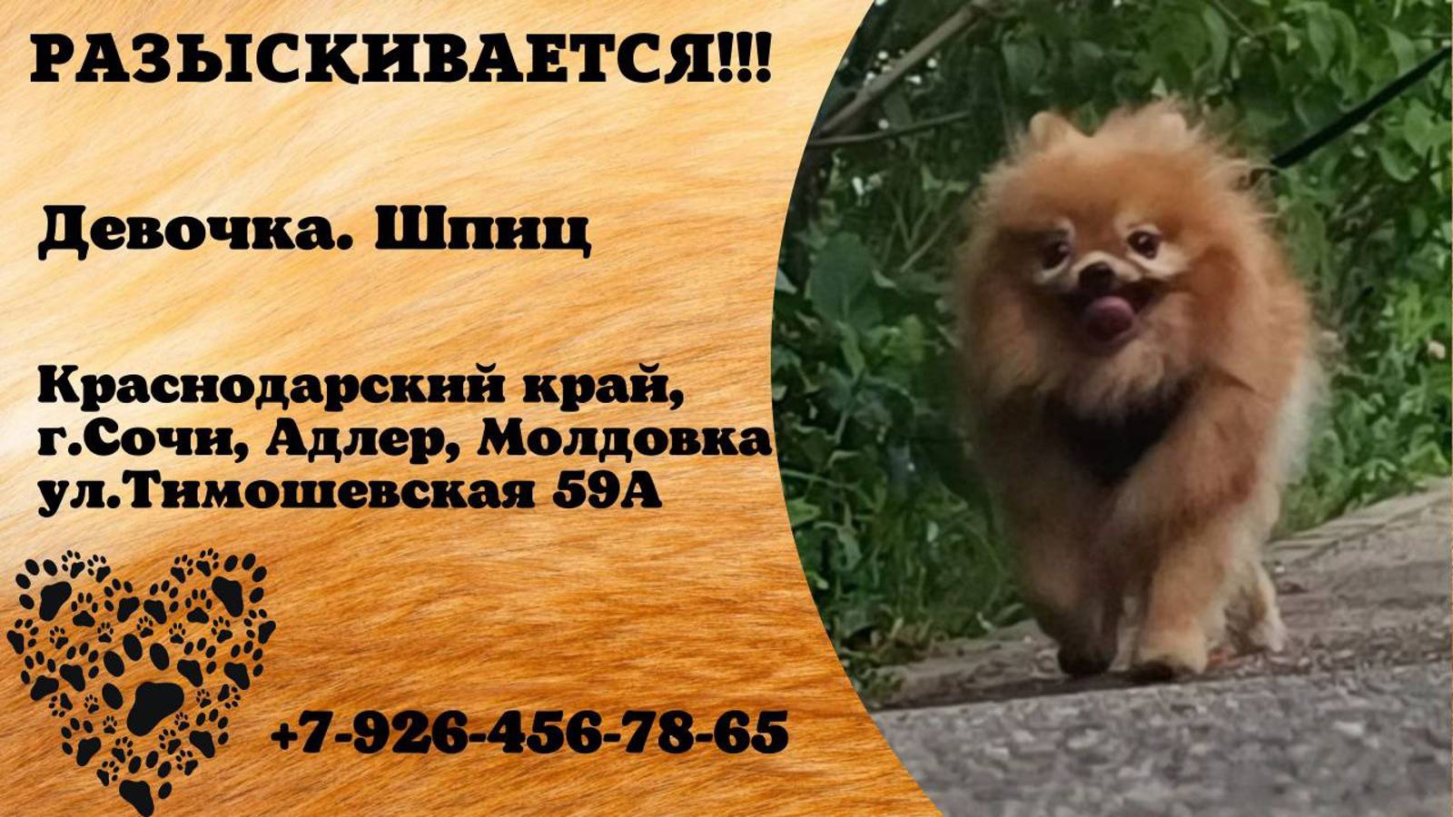 Краснодарский Сочи, Адлер, Молдовка Пропала собака 13.09 ул.Тимошевская 59А. Пропала девочка шпиц. Если знаете что-то о собаке, номер хозяйки 89264567865 Инфо https://vk.com/wall-198815410_153557