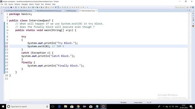 Finally Block will not be executed if there is System.exit(0) in try block. The java.lang.System.exit() method exits current program by terminating running Java virtual machine (JVM). This method takes a status code. A non-zero value of status code is generally used to indicate abnormal termination. This is similar exit in C/C++. Following is the declaration for java.lang.System.exit() method: public static void exit(int status) exit(0) : Generally used to indicate successful termination. exit(1) or exit(-1) or any other non-zero value – Generally indicates unsuccessful termination. Note : This method does not return any value.