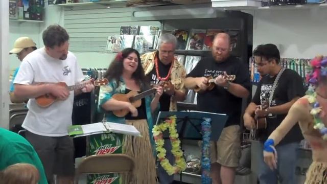 Bunny Flower leads the Southeast Ukers in Ukulele Zombie at Galactic Quest Comics in Buford GA, 7-16-11. The Zombie Luau was held to celebrate the comic Tiki Zombie. Buy it! Thanks to Clara the dancing zombie.