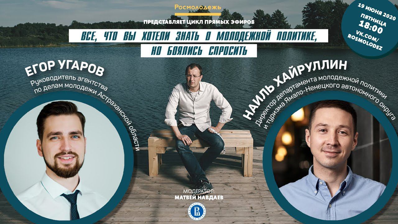 Сегодня в онлайне встретились руководитель агентства по делам молодежи Астраханской области Егор Угаров и директор департамента молодежной политики и туризма Ямало-Ненецкого автономного округа Наиль Хайруллин. Все желающие смоггли задать свои вопросы в комментариях к эфиру. Тема встречи – «Все, что вы хотели знать о молодежной политике, но боялись спросить». Модератором стал общественный советник руководителя Росмолодежи, программный директор Всероссийского молодежного образовательного форума «Территория смыслов» Матвей Навдаев. Организатором трансляций выступает Федеральное агентство по делам молодежи при поддержке Международной ассоциации студенческого телевидения.