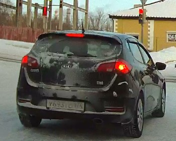 Пересечение стоп-линии и выезд на перекрёсток на запрещающий движение сигнал светофора. Госномер нарушителя У693ТО 174, KIA Sportage 2015 г.в., коричневый. Перекрёсток ул. Лесопарковой и ул. Гагарина. 02-02-2022 п. 6.16 ПДД Дорожный знак "Стоп-линия". Место остановки транспортных средств при запрещающем сигнале светофора. п. 6.2. ПДД - жёлтый сигнал запрещает движение, красный сигнал запрещает движение, зелёный сигнал разрешает движение. п. 6.13 ПДД - при запрещающем сигнале светофора... водители должны остановиться перед стоп-линией (знаком 6.16).