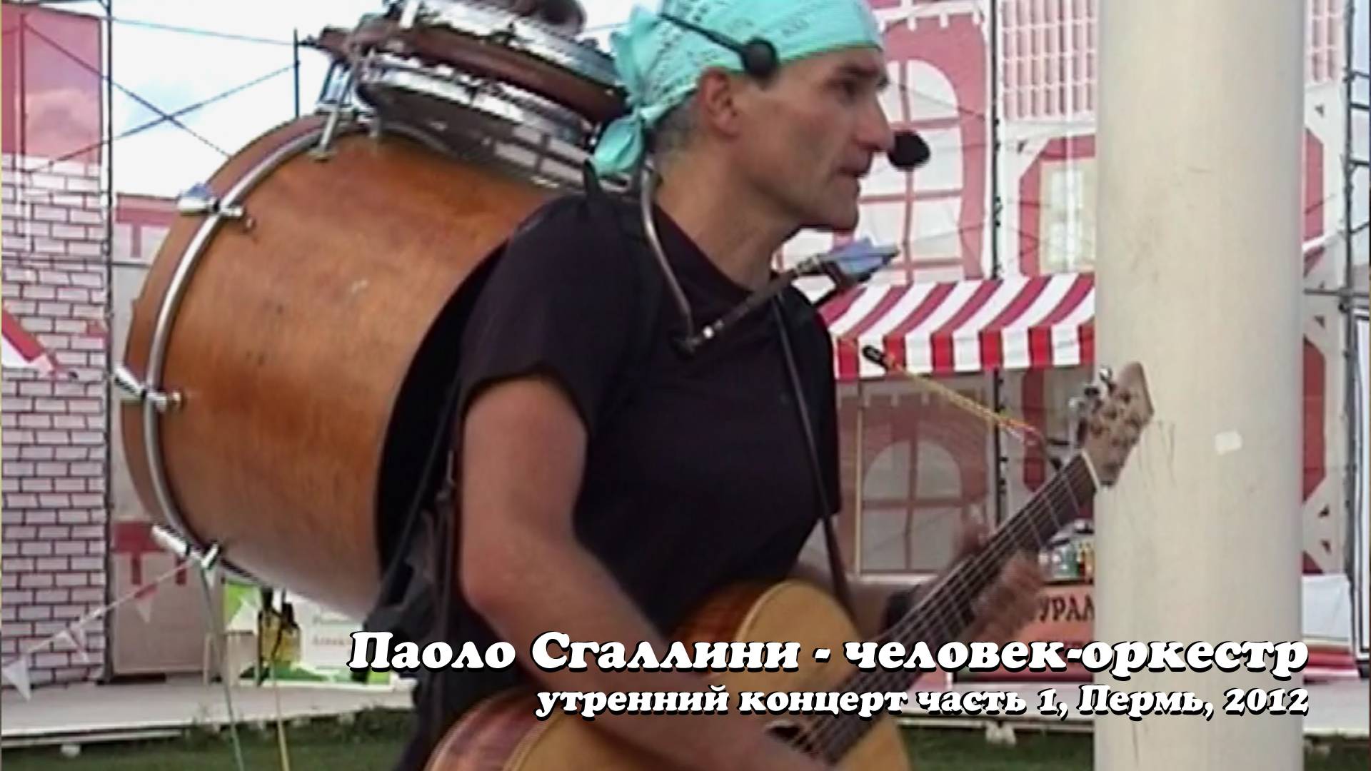 ПАОЛО СГАЛЛИНИ, человек-оркестр (Пермь 2012г.). Утренний концерт, часть 1 / 4. Еще раз представляю вам моего лучшего итальянского друга Паоло Сгаллини. Он профессиональный музыкант из Римини, играет на гитаре, укулеле, ударных инструментах, гармонике, казу. В его репертуаре песни известных исполнителей: Битлз, Пинк Флойд, Боба Дилана, Карла Перкинса, Брюса Спрингстина, Джона Денвера и многих других. В июле 2012г. Паоло был приглашен на фестиваль Белые ночи в Пермь. Я с моим другом Ильей Васильевым (он тоже профессиональный музыкант, композитор, поэт и участник дуэта Пигмалион) специально приехали в Пермь для встречи с Паоло. Мне удалось снять на видео два концерта Паоло: утренний (который я разделил на 4 части) и вечерний (разделен мною на 5 частей). В вечернем концерте интересно наблюдать, как к Паоло присоединяются два молодых пермских музыканта. Сначала очень удачно подключился молодой парень с барабаном Тарабука (у Паоло к этому моменту начались неполадки с его ударной установкой). А затем к ним примкнул молодой гитарист. Так случайно и быстро, без всяких предварительных репетиций, сформировалось интересное трио. Это был настоящий живой концерт со своими плюсами и минусами: импровизации, шутки Паоло, уточнение тональностей песен, шумы зрителей, других артистов и участников фестиваля, пролетающих над городом истребителей, сбои с аппаратурой (Паоло периодически вызывал звукооператора Алекса для корректировки уровней громкости инструментов и голоса). Надеюсь, просмотр будет интересным для вас! PAOLO SGALLINI - One Man Band from Rimini (Italy) in Perm (Russia 2012). Morning Concert part 1 And once again I am pleased to introduce you to my best Italian friend Paolo Sgallini. He is a professional street performer from Rimini (Italy). He calls himself the "One-Man-Orchestra". He plays guitar, percussion, harmonica, kazoo, ukulele. His repertoire is very wide: from rock'n'roll and blues to reggae, country, jazz and pop. He performs and sings songs by the Beatles, Pink Floyd, Carl Perkins, Bob Dylan, Bruce Springsteen, John Denver, Johnny Cash and many others, including songs by Italian composers. In July 2012 Paolo visited Perm (Russia). He was invited to the White Night festival. Me and my friend Ilya Vasiliev (also a professional musician, composer and the author of songs, the member of the Duo Pygmalion) specially came to Perm to meet with Paolo. On this day we saw two Paolo' concerts (morning and evening ones), which I luckily captured on video camera. Here you can watch the first part of the morning concert. I divide this morning's concert into 4 chapters. The evening concert was divided by 5 parts. At the evening concert, you will see that Paolo was joined by young Permians musicians. First, an young man with a Tarabuka drum, and then another guy with an electric guitar. This was a real suddenly created group without any prior preparation or rehearsals! These were real live concerts with their pros and cons (improvisations, crowd noise, noise of engines, some hardware problems, etc.). All live, all natural and atmospheric! I really hope you will find this interesting for you! Enjoy!