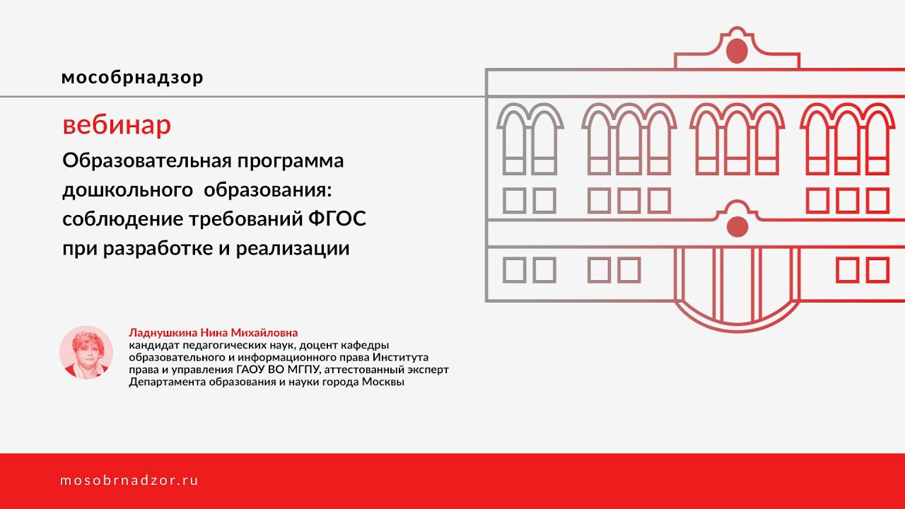 Вебинар «Образовательная программа дошкольного образования: соблюдение требований ФГОС при разработке» был проведен в рамках проекта Мособрнадзор.РФ 13 марта 2021 года. Ведущая вебинара - Ладнушкина Н.М. Страница вебинара на сайте проекта - http://mosobrnadzor.ru/prevention/webinars/2021-03-13_12-00
