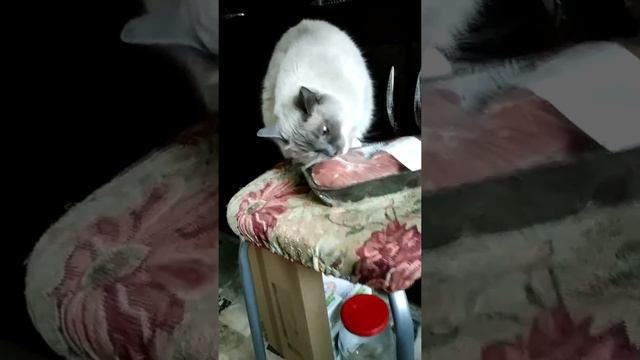 Кошка ест свинину