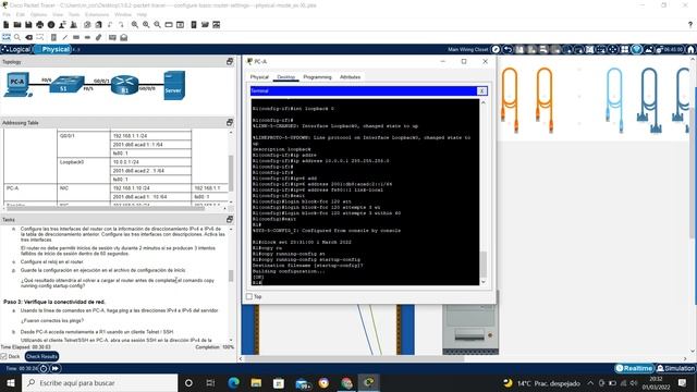 CCNA 2 1.6.2 Laboratorio: configuración del router básico ( Español ) Switching, Routing, y Wireless Essentials v7.02 PDF: https://drive.google.com/file/d/1jC4fhE3-30bI6BTyusuBY703nfo6NFBK/view?usp=sharing PKA: https://drive.google.com/file/d/15ePM5OIXBaI8dH0N3GuwrEOdCZ1vdyi1/view?usp=sharing Comandos router: https://docs.google.com/document/d/1gdvMbdqGtr-2N3CYBd9MlcZgqLrzMc9LuqBFfoRgwVs/edit?usp=sharing