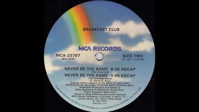 Breakfast Club – Never Be The Same Label: MCA Records – MCA-23797 Format: Vinyl, 12", 33 ⅓ RPM, Single Country: US Released: 1987 Genre: Electronic, Pop Style: Synth-pop Tracklist A Never Be The Same (The Shep Pettibone Mix) B1 Never Be The Same (The Club Dub) B2 Never Be The Same (The Breakfast Beats) Edited By – Junior Vasquez, Shep Pettibone Engineer [Remix] – Steve Peck Illustration [Logo] – Todd Schorr Photography By – Jim Shea Producer – Michael Verdick, Stephen Bray Remix, Producer [Additional] – Shep Pettibone Written-By – D. Gilroy, S. Bray