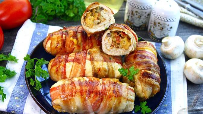 Ломтики куриного филе сначала отбиваются, а затем наполняются ароматной начинкой из предварительно обжаренных грибов, сыра и свежих помидоров. Рулеты получаются сочными и нежными. Обернув их ломтиками бекона, вы добавите блюду насыщенный вкус и аппетитную корочку при запекании. #КуриныеРулеты #РулетыСГрибами #РулетыССыром #РулетикиИзКурицы