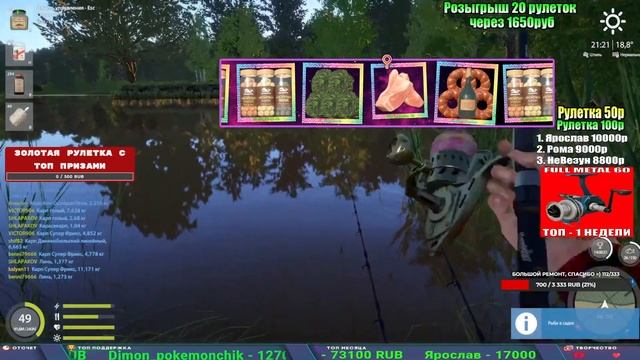 Поддержка донатом https://new.donatepay.ru/@1032463 Альтернативный донат https://www.donationalerts.com/r/kalyamba11 5536913964533059 карта Тинькоф Если стрим лагает,смотри стрим на трово https://trovo.live/s/Kalyamba_na_Ribalke Тг https://t.me/kalyamba_na_ribalke Мой ВК - https://vk.com/kalyantv НИК в игре kalyan11 НАШ ДС https://discord.gg/4ZzSQkQtsK Заказ водоема на 1 час - 500р ( весь стрим 2500р ) Модерка на канале 1300р ( каждая следующая на 100р больше) ✅Призы в рулетке "ЗОЛОТАЯ" 500р ✔ ЗОЛОТО ✔ ПРЕМ ✔ КАТУШКИ РАПТОР 40, ВЕНГИ, ТАЙГА, СИЛЬВЕР 80, И другие ✔ ПАЛКИ ПИЛКЕРНАЯ, ДОНКА МОРСКИЕ, ✔ РОД ПОД, СТУЛЬЯ ✅Призы в рулетке СТАНДАРТ : 100р ✔ катушкИ РАПТОР 40, ВЕНГИ, ТАЙГА, СИЛЬВЕР 80, И другие ✔ катушки 60 для медного ( ЭВИИ, НАТОРЫ, ГОЛДА, и тд) ✔ ПИЛКЕРНОЕ УДИЛИЩЕ КОРОЛЕВА ОКЕАНА ✔ Морское Донное удилище ✔ прем ( 3, 7, 30 дней) ✔ золото ( 1, 3, 5, 10, 20 ,50) ✔ билет на море ( 1, 3, 5 дней) ✔ голд наживка и др. ✅Призы в рулетке "СТАРТОВАЯ" 50р ✔ катушка Венга ✔ катушка "silver80" ✔ катушка "БЕЛЫЙ КАЛИБР" ✔ катушка "Черный калибр" ✔ катушка "Протон" ✔ катушка "Нарга 6000" ✔ Набор Фидерист и спинингист ✔ Карповик Фортуна ✔ фидерные удилища ✔ прем, золото, алкашка, наживки и тд P.s Рулетка это не казино, а награда за поддержку стримера. Вечный ТОП ПОДДЕРЖКИ (10.06.2025) 1. Леха сварной 214 572 2. Dimon_pokemonchik 127 034 3. Skreb79 103 061 4. Interceptor 96 230 5. FishRus86 82 500