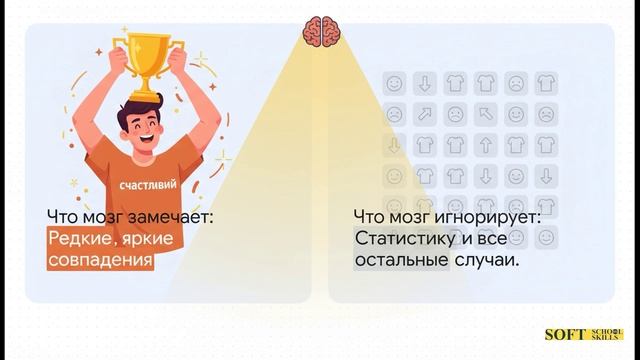 Чтобы закрепить знания и получать ежедневные порции полезных инсайтов, присоединяйтесь к нашему сообществу в Telegram-канале «Ошибк Шибки». Здесь мы кратко и емко разбираем конкретные примеры искажений из повседневности, делимся интересными фактами и проводим мини-эксперименты. Это ваш ежедневный тренажер для развития гибкого и острого ума. ➠ Переходите по ссылке и подписывайтесь: https://t.me/error_verus (или укажите актуальную ссылку) Всё о когнитивных искажениях, которые управляют вашими решениями. Краткие разборы ошибок мышления с простыми советами, как их избегать. ➠ Продолжение онлайн-курса ментальных ошибок: https://stepik.org/course/244049/promo 102. Иллюзорная корреляция Ситуация. Ты замечаешь, что в день, когда ты носишь свою "счастливую" футболку, твоя команда выигрывает. Или ты видишь два три раза, как человек в очках допустил ошибку в отчете, и делаешь вывод, что люди в очках более невнимательны. Ты видишь связь между двумя событиями или признаками, которой на самом деле нет или она гораздо слабее. Эффект. У тебя формируется ложная уверенность, что эти два явления связаны причинно-следственной или статистической связью. Эта вера влияет на твое будущее поведение: ты продолжаешь носить "счастливую" вещь или неосознанно начинаешь с недоверием относиться к людям в очках, ожидая от них ошибок. В чем подвох (т.е. какая когнитивная ошибка). Ошибка в том, что твой мозг игнорирует статистику и обращает внимание только на случаи, которые подтверждают твою гипотезу. Ты запоминаешь те дни, когда футболка и победа совпали, и забываешь многочисленные дни, когда команда проигрывала, а ты был в этой же футболке. Мозг переоценивает редкие или яркие совпадения. Проще говоря. Ты видишь связь там, где ее нет, потому что запоминаешь только то, что совпало, и не считаешь все остальные случаи. Твои впечатления обманывают тебя. Контрмера. Спроси себя: "А я учитываю все случаи, а только те, что в памяти?". Попробуй вести простой учет. Запиши, сколько раз событие А (носил футболку) совпало с событием Б (победа), а сколько раз не совпало. Ищи объективные данные и статистику, а не полагайся на память и яркие впечатления. Часто простая запись быстро показывает, что связи нет.