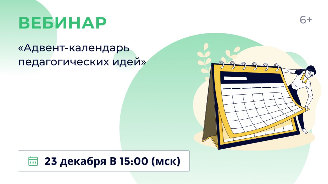 23 декабря в 15:00 (мск) приглашаем учителей, преподавателей организаций СПО, методистов, педагогов дополнительного образования, администрацию образовательных учреждений и представителей ИРО на вебинар «Адвент-календарь педагогических идей». Спикер: Ольга Владимировна Арманская тренер-преподаватель, игропрактик, автор образовательных игр, вице-президент по развитию компетенций и социальному партнёрству Ассоциации «Экспертное сообщество социальных инициатив», член Гильдии маркетологов (образование).
