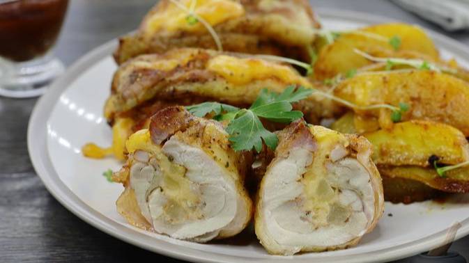 Из куриных бёдер формируются рулетики с ананасами и сыром, которые затем запекаются с картофелем. Куриные рулетики с начинкой получаются очень сочными внутри и румяные снаружи, а картофельные дольки - мягкие и ароматные. #ЗапечённаяКурица #КурицаСАнанасами #КурицаССыром #КурицаВДуховке