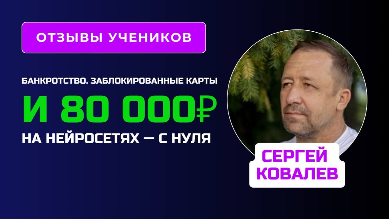✅ Если вы хотите зарабатывать с помощью нейросетей, запишись на бесплатный 3-дневный интенсив ➡ https://prodschool-obuchenie.ru/nn-land09-main/?utm_source=baza&utm_medium=gBEppOM1GS85kwo6EKGmCg 🎬 Видео интервью ученика по курсу заработка на нейросетях для новичков. Ставьте скорость х1,5-х2, чтобы сэкономить время. Банкротство. Заблокированные карты. И 80 000 ₽ на нейросетях — с нуля Сергей пришёл на обучение в момент, когда денег нет буквально: идёт процедура банкротства, банковские карты заблокированы, работать «по-старому» невозможно. Никаких запасов. Никакой подушки. Просто ситуация, где нужно выкручиваться. Он начал с самого простого: — тексты — мелкие задания — первые отклики — работа через знакомых, Telegram, рекомендации Без «больших чеков» и без иллюзий. За 3 месяца — около 80 000 ₽. Постепенно. Без рывков. Но реально. Нейросети сократили время в разы: то, на что раньше уходили часы, стало делаться за минуты. Появилась структура, понимание, уверенность в том, что он делает. Это не история «как быстро разбогатеть». Это история про новый путь с нуля, когда других вариантов просто нет. Браво Сергей 👏🏻👏🏻 📢 Делись видео с друзьями: https://rutube.ru/video/private/6177fe3ffd86fa2d2b4b15f0ad9efd98/?p=gBEppOM1GS85kwo6EKGmCg 📺 Подписывайся на канал: https://www.youtube.com/ДмитрийДьяков1 📌 Группа Вконтакте https://vk.com/prodvizhenie_school 📌 Мой профиль ВКонтакте: https://vk.com/dyakov_d 📌 Telegram канал школы: https://t.me/prodvizhenie_school 📌 Telegram канал нейросетей: https://t.me/pro_ai_novosti 🎬 Другие видео-отзывы наших учеников: ⏩https://rutube.ru/video/a79fe767551548bfa060dc0c62343519/ ⏩https://rutube.ru/video/07ffa8547f9d83c425f653dc99350609/ ⏩https://rutube.ru/video/aa9fd52d5af94e6c696590aafbbe500e/ ⏩https://rutube.ru/video/028be1023442b8f2528c8622142faa5f/ ⏩https://rutube.ru/video/387307f4fe6a8b14e7aeab9e2ab8b9ba/ ⏩https://rutube.ru/video/04ab02a3da262e1cfa303fdf7f3ef29d/ ⏩https://rutube.ru/video/523068f2aea9e21843339bcb35027fb9/ ⏩https://rutube.ru/video/cff3e43f94e28694970d2fe76492d19d/ ⏩https://rutube.ru/video/3f21a4be8b1dc329330f3708abedf299/ ⏩https://rutube.ru/video/b32ddc6e7987f6b519f02bed168d4a12/