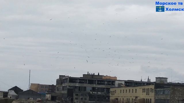 Чайки и голубь в городе Холмск