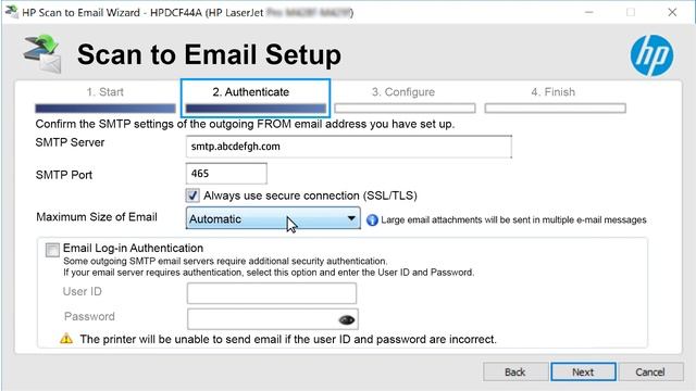 특정 HP LaserJet Pro M300-400 프린터에서 마법사를 사용하여 이메일로 스캔 설정 | HP Support