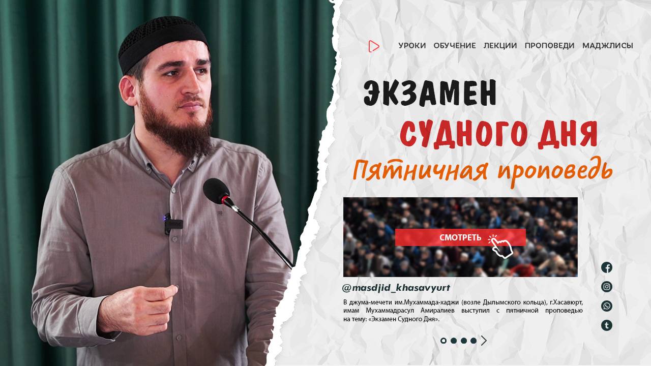 #джума #проповедь #хасавюрт #дагестан 1 ноября 2024 г. в джума-мечети им.Мухаммада-хаджи (возле Дылымского кольца), г.Хасавюрт, имам Мухаммадрасул Амиралиев выступил с пятничной проповедью на тему: «Экзамен Судного Дня». _______________________________________________ Мы в YouTube - http://www.youtube.com/masdjid_khasavyurt Мы в Facebook - http://www.facebook.com/masdjid_khasavyurt Мы в Instagram - http://www.instagram.com/masdjid_khasavyurt Мы в Telegram - http://www.t.me/masdjid_khasavyurt