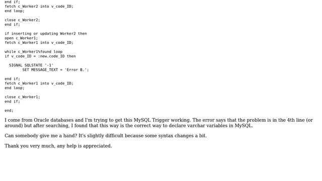 Databases: Trying to get this MySQL Trigger working Helpful? Please support me on Patreon: https://www.patreon.com/roelvandepaar With thanks & praise to God, and with thanks to the many people who have made this project possible! | Content (except music & images) licensed under CC BY-SA https://meta.stackexchange.com/help/licensing | Music: https://www.bensound.com/licensing | Images: https://stocksnap.io/license & others | With thanks to user user47579 (dba.stackexchange.com/users/35439), user Jehad Keriaki (dba.stackexchange.com/users/29289), and the Stack Exchange Network (dba.stackexchange.com/questions/65731). Trademarks are property of their respective owners. Disclaimer: All information is provided "AS IS" without warranty of any kind. You are responsible for your own actions. Please contact me if anything is amiss at Roel D.OT VandePaar A.T gmail.com