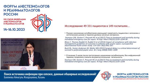 Видеозапись ФАРР-2023, XXI съезд Федерации анестезиологов и реаниматологов 14-16 октября 2023, Санкт-Петербург. Айнагуль Жолдошевна Баялиева "Поиск источника инфекции при сепсисе, данные обширных исследований!"