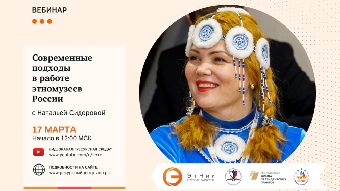 Информационный вебинар о современных подходах в работе этномузеев России. Его проведёт участник тематического хаба «Этномода и этномузеи» всероссийского проекта «ЭтНик: ресурсное сообщество», художественный руководитель Таймырского Дома народного творчества, руководитель проектной деятельности Союза хранителей этнокультурных традиций Таймыра Наталья СИДОРОВА. На вебинаре вы узнаете, какие бывают этномузеи, как создать свой этномузей с нуля, а также познакомитесь с актуальными законодательными актами и системой государственной поддержки данной сферы. Вебинар «Современные подходы в работе этномузеев России» состоится в рамках всероссийского проекта «ЭтНик: ресурсное сообщество», который разработан и реализуется Ресурсным центром в сфере национальных отношений в партнёрстве с Ассамблеей народов России при поддержке Фонда президентских грантов. #ЭтНикРесурсноеСообщество #РесурснаяСреда #РесурсныйЦентр #ЭтНик #РесурсноеСообщество #этнокультурныеНКО #ОткрытыйВебинар #национальныеотношения #этновыставка #этномузей #этнопроект
